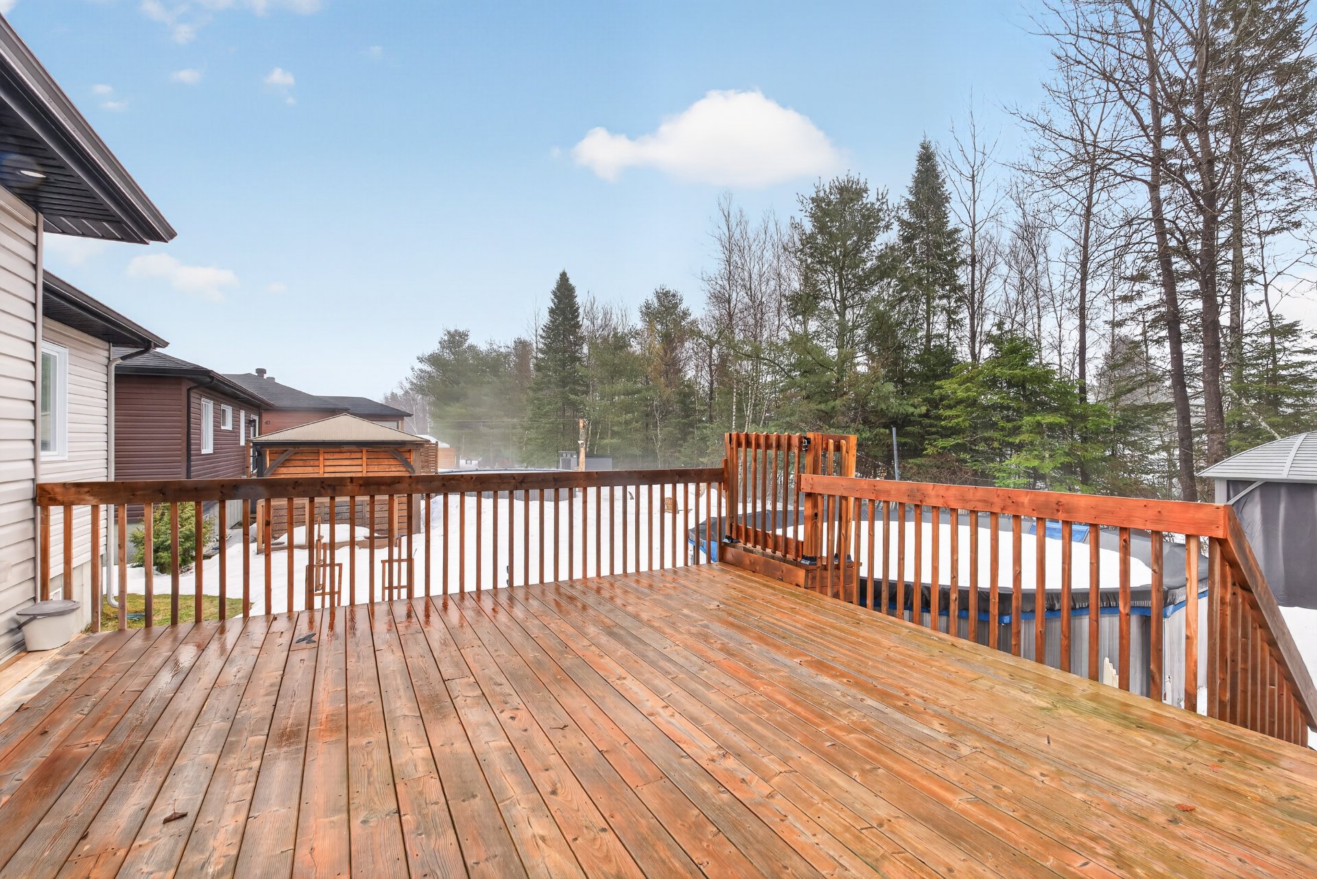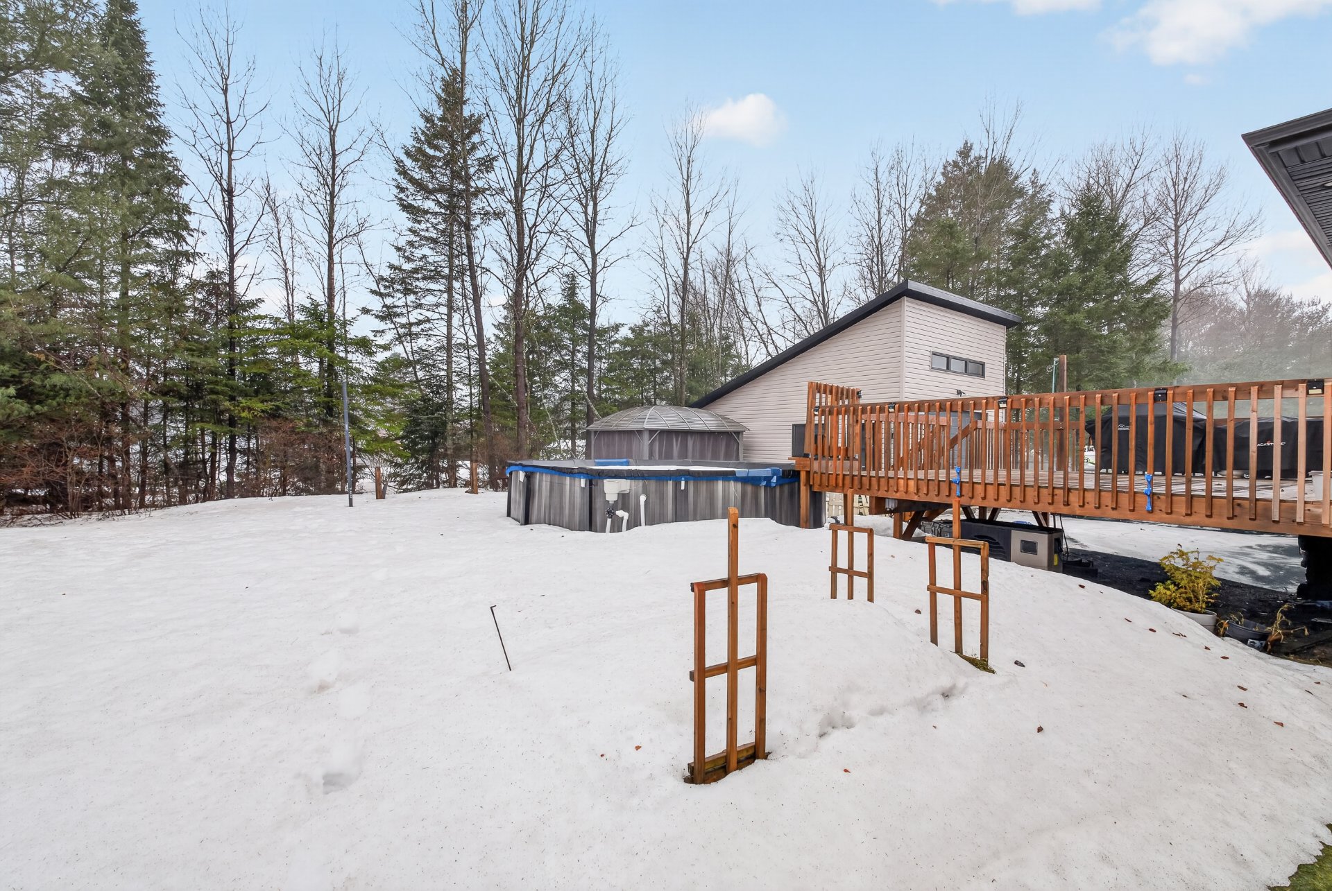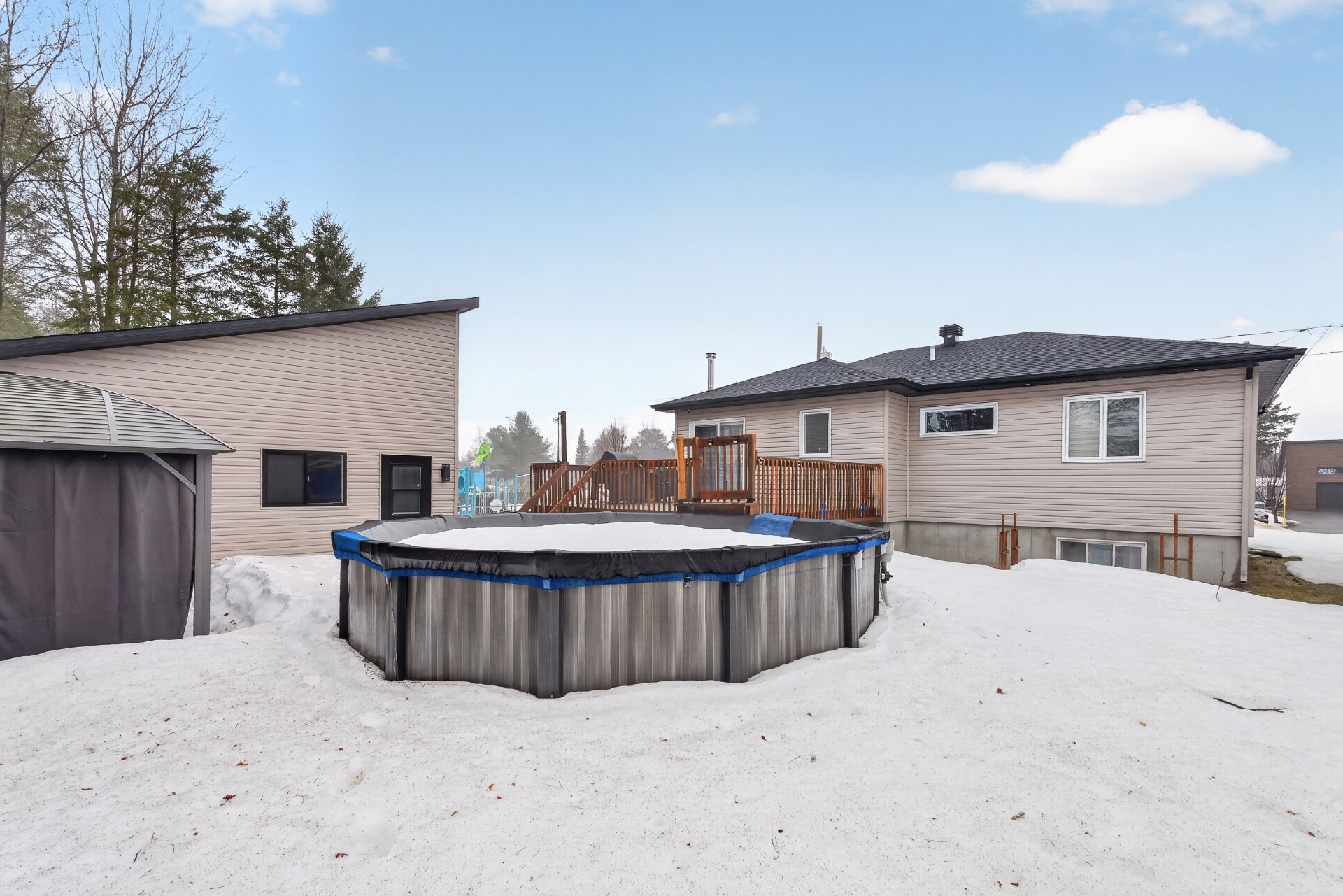 Inclus : Gazebo extérieur, piscine et ces accessoires, thermopompe, aspirateur centrale, meubles d'entrée blanc 4 panneaux