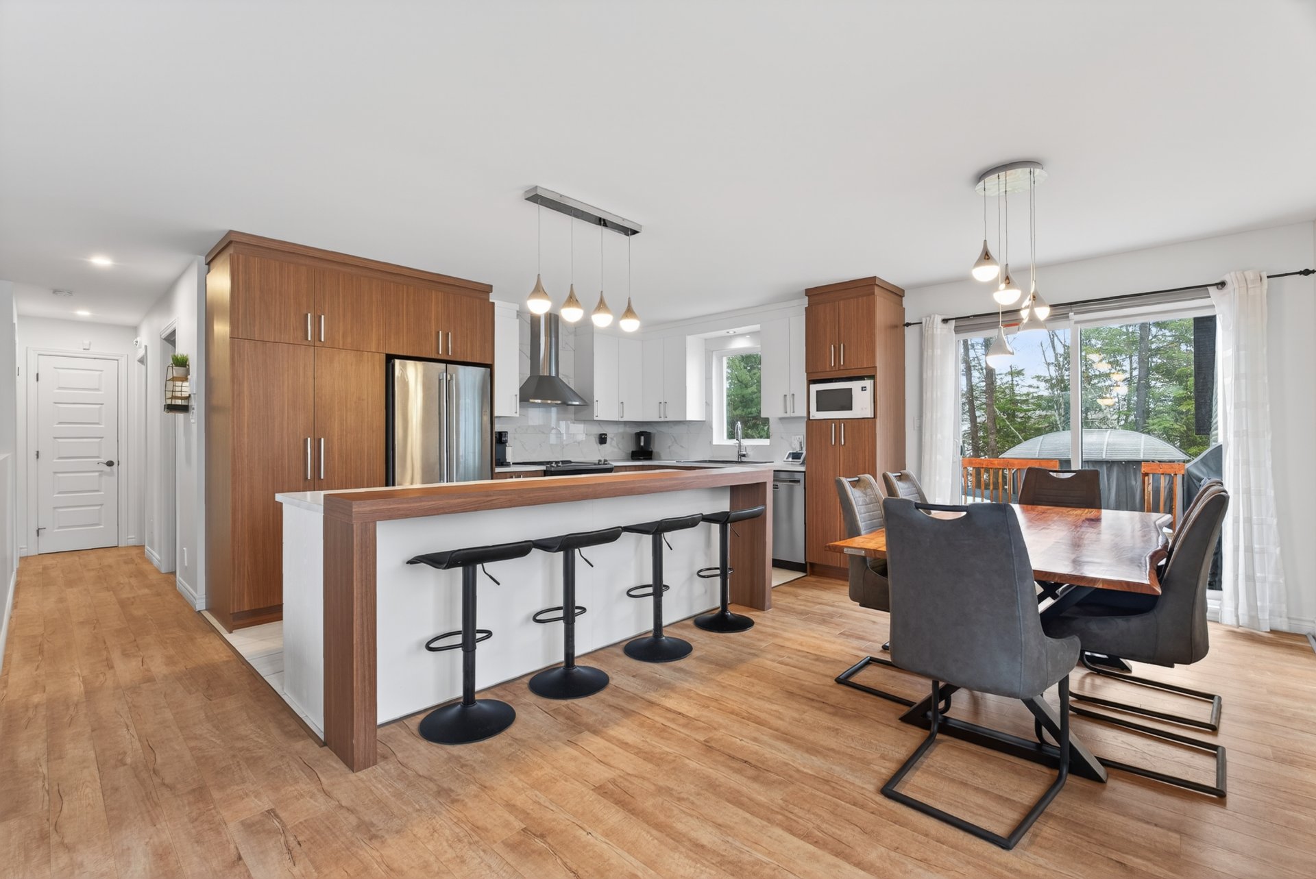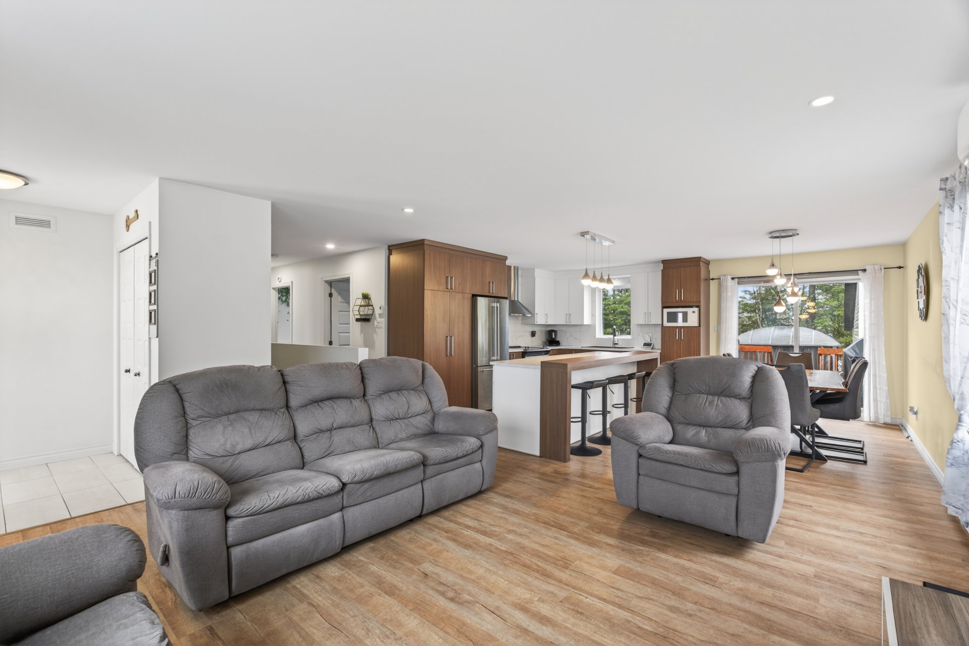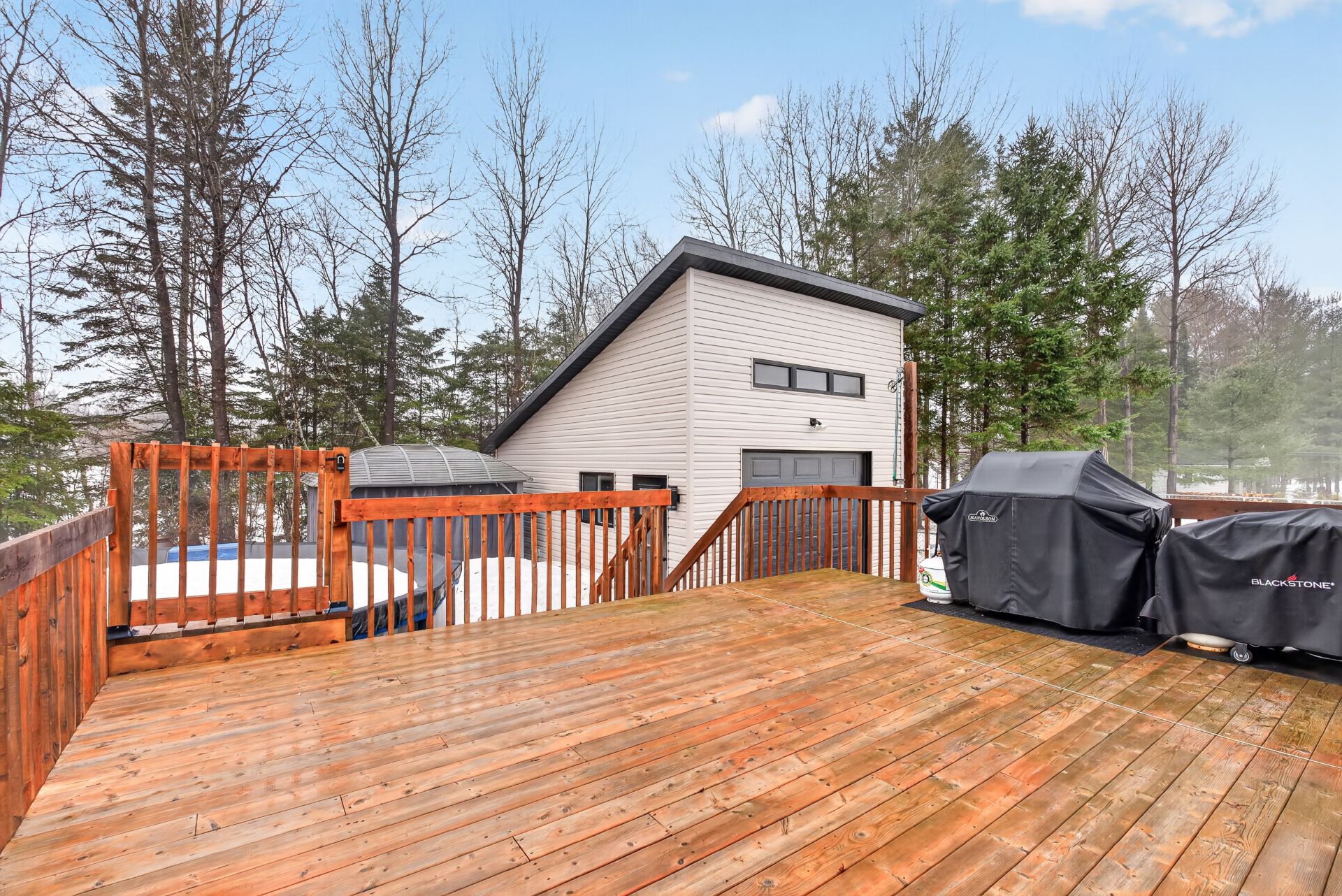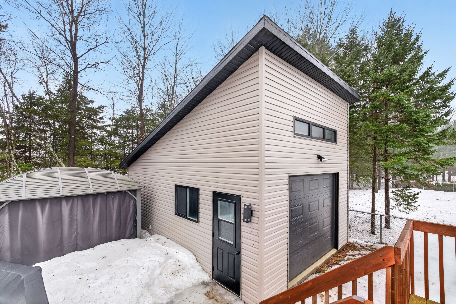 Inclus : Gazebo extérieur, piscine et ces accessoires, thermopompe, aspirateur centrale, meubles d'entrée blanc 4 panneaux